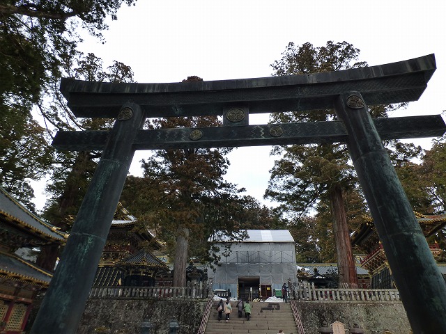 銅鳥居から堂々見えるはずの国宝「陽明門」は平成の大修理中でシートを被っています。