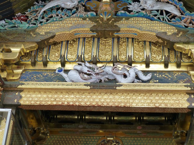 唐門の中央には、金地の波に白龍が彫られ、「青海波に玉取りの白龍」と呼ばれています。