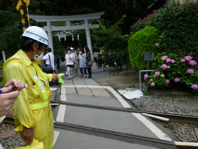 踏切の警報音が鳴り出すと、江ノ電と紫陽花の写真を撮るために身を乗り出す観光客に