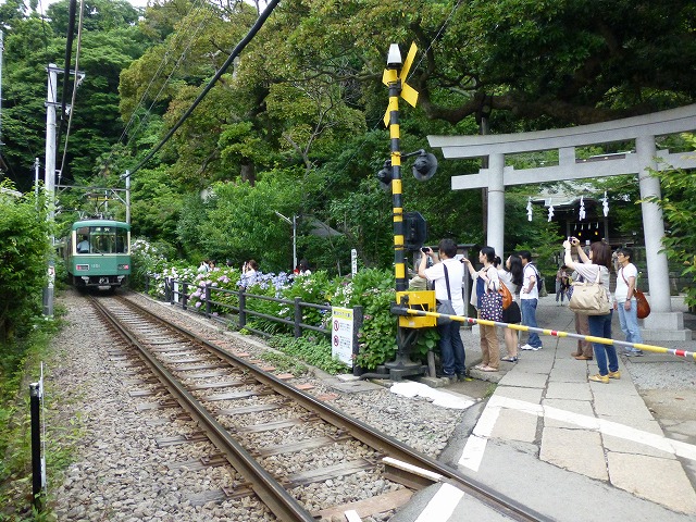 鳥居の眼前を江ノ電が通ることで知られ、