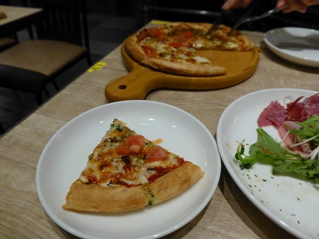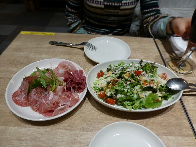 冷製ソーセージの盛り合わせ(チェコ)・シーザーサラダ(アメリカ)・WBMトマトピザ(イタリア)・ピクルス(アメリカ)。
