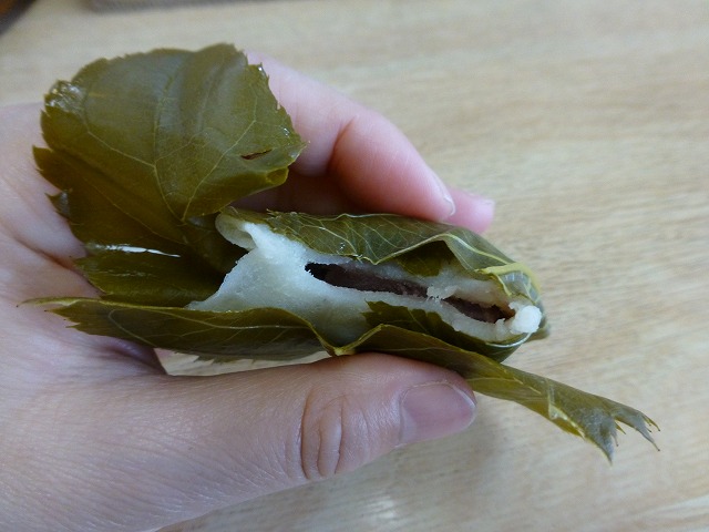 葉をはずして、お餅にうつった桜葉の香りを楽しみます。