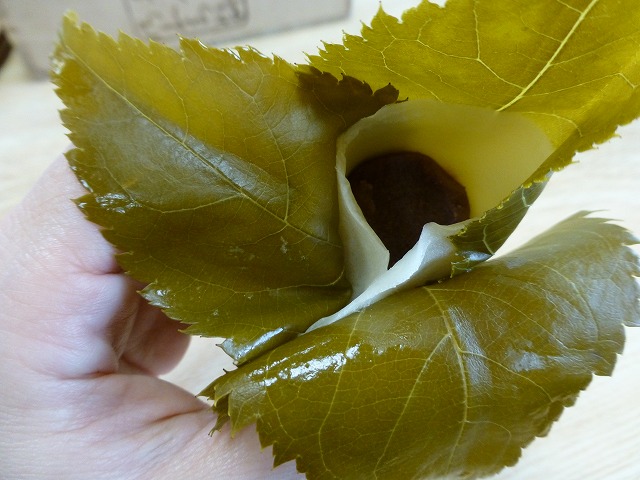 塩漬けにしたオオシマザクラの桜葉3枚に包まれた「長命寺桜もち」の姿をまずは目で堪能。