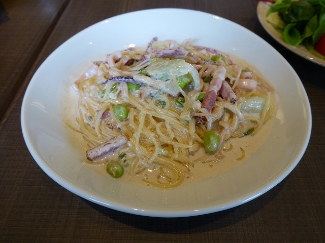 メインのスパゲティー。わさびとホワイトソースってこんなに合うのね!新鮮でした。