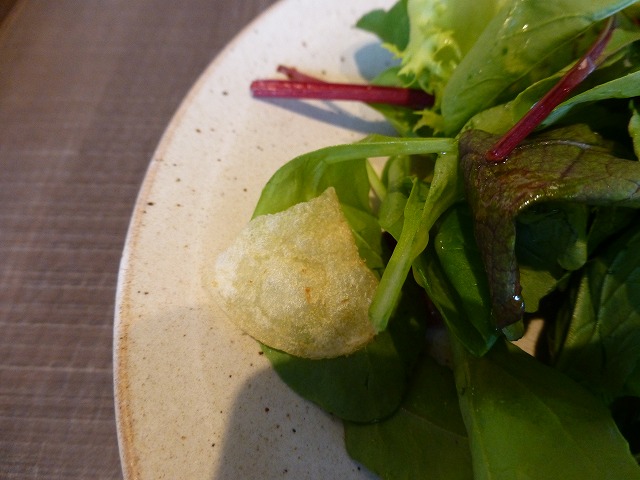 彩り豊かなサラダには「カルビー」の看板商品、ポテチの破片が乗っかっていました^^