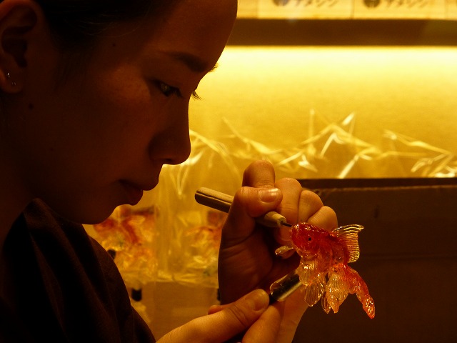 真剣な横顔と眼差し、その手元からまるで本物のような金魚がいままさに生まれようとしていました。