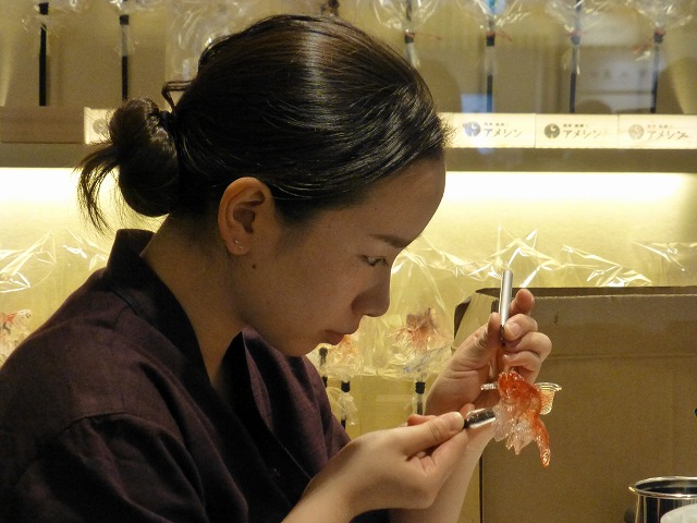 東京ソラマチ・イースト4Fの「浅草飴細工 アメシン」でリアルすぎる金魚の飴細工の製作実演を見物。