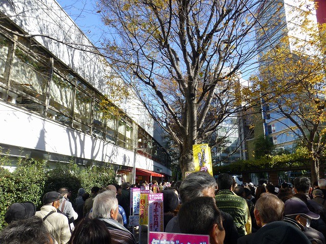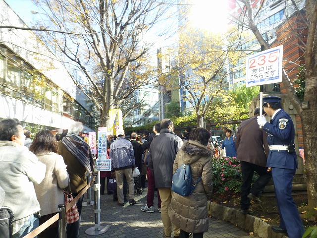 最も人気のある1番窓口は2時間待ちとのことです。晴海通りの方まで列が延びています。