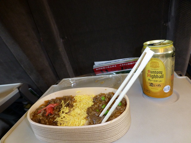 お弁当はおそろいでW牛肉弁当。ハイボール濃いめとともに。