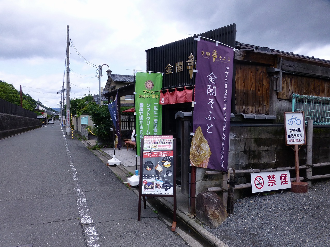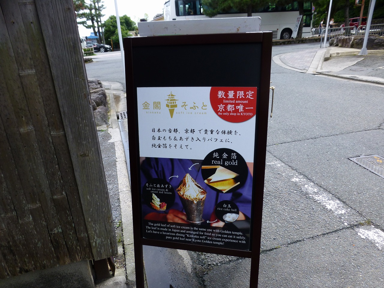 「金閣寺道」バス停で下車して徒歩2分ほど、金閣寺門前の路地に「金閣そふと」が。
