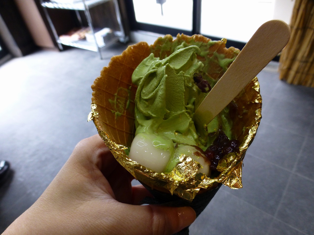 純金箔を食べると、コーンの中から小豆・白玉が2個現れます。
