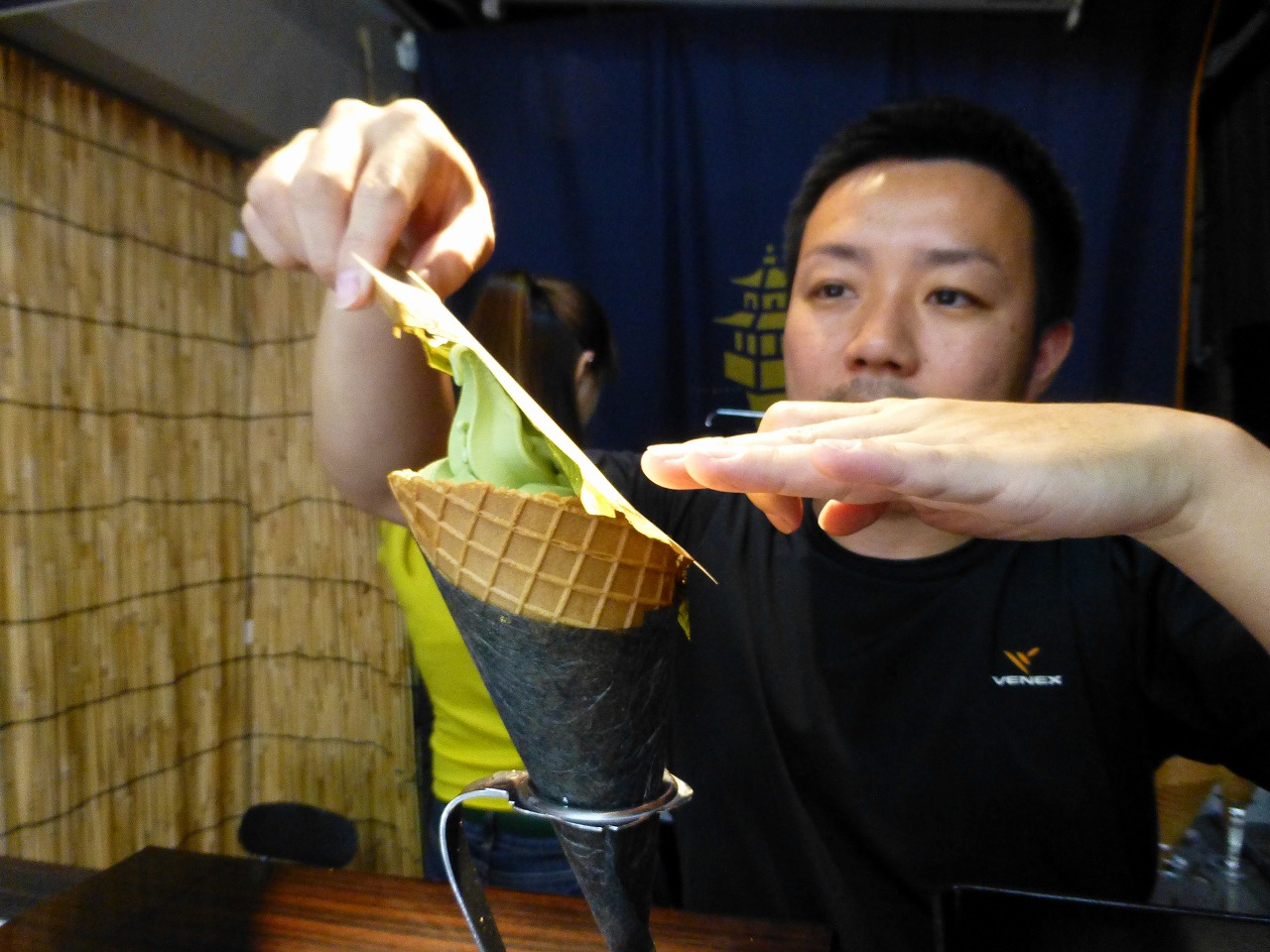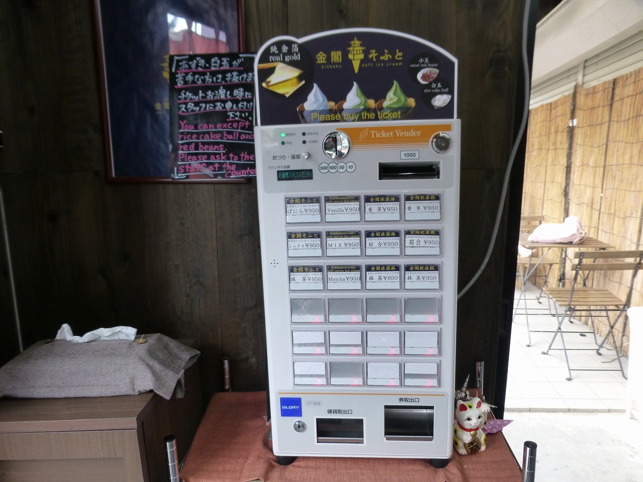 自販機でソフトクリームの「抹茶」を選んで食券購入、さっそく私の「金閣そふと」を作ってもらいます。