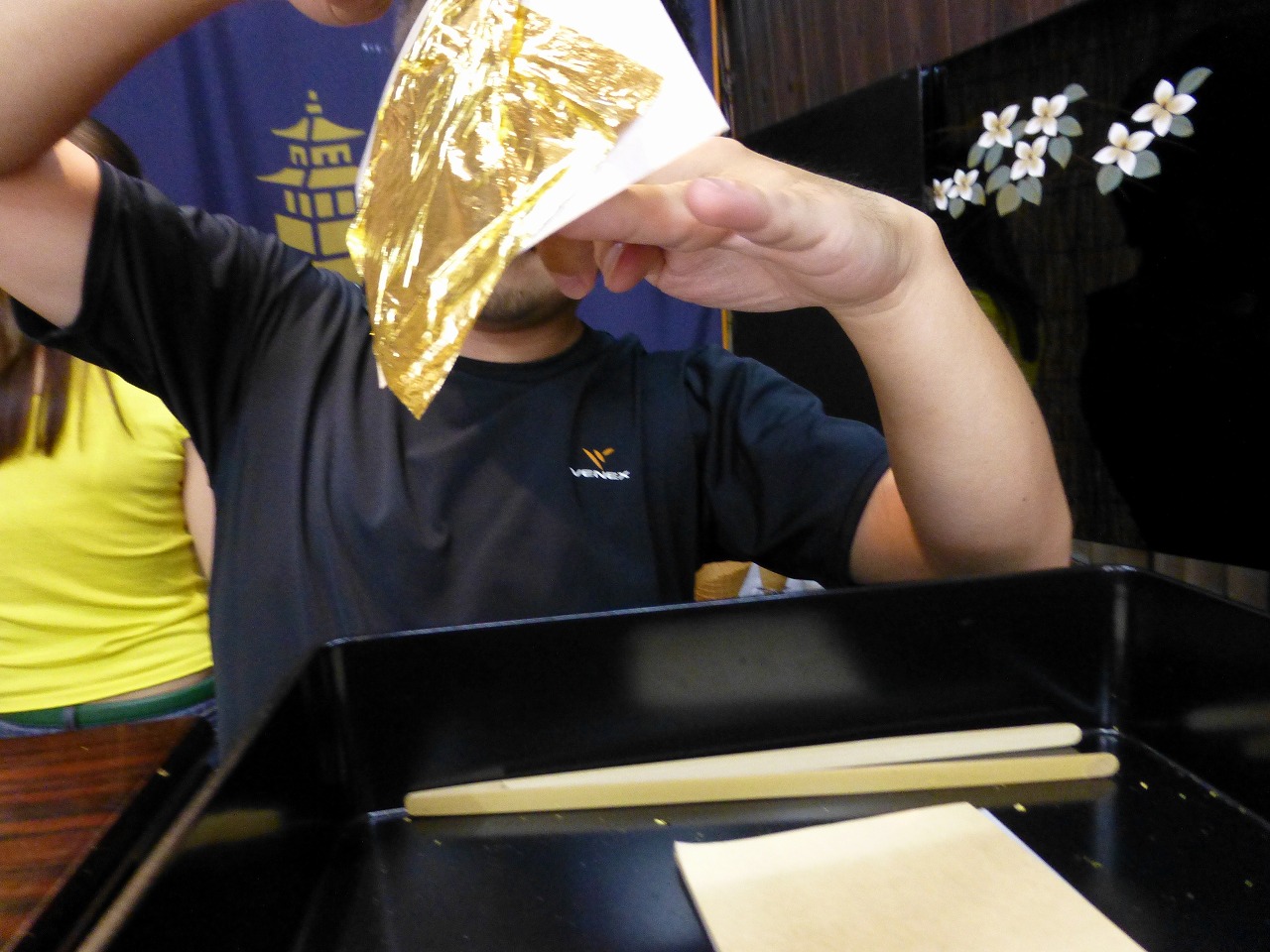 漆塗りと思しき黒い手箱を開けて、中から1枚、純金箔の中でも最高級の食用専用の純金箔が剝がし取られ、