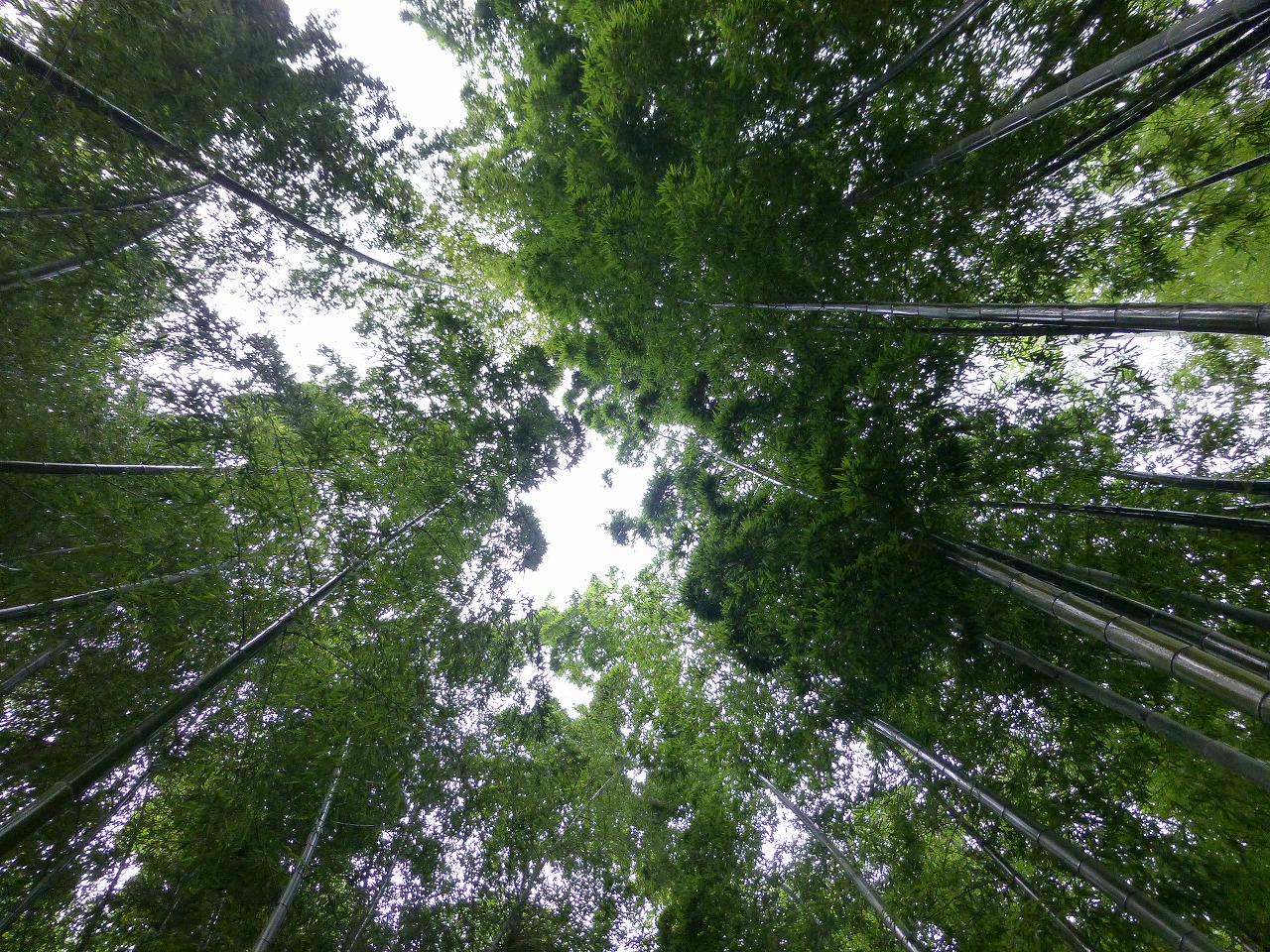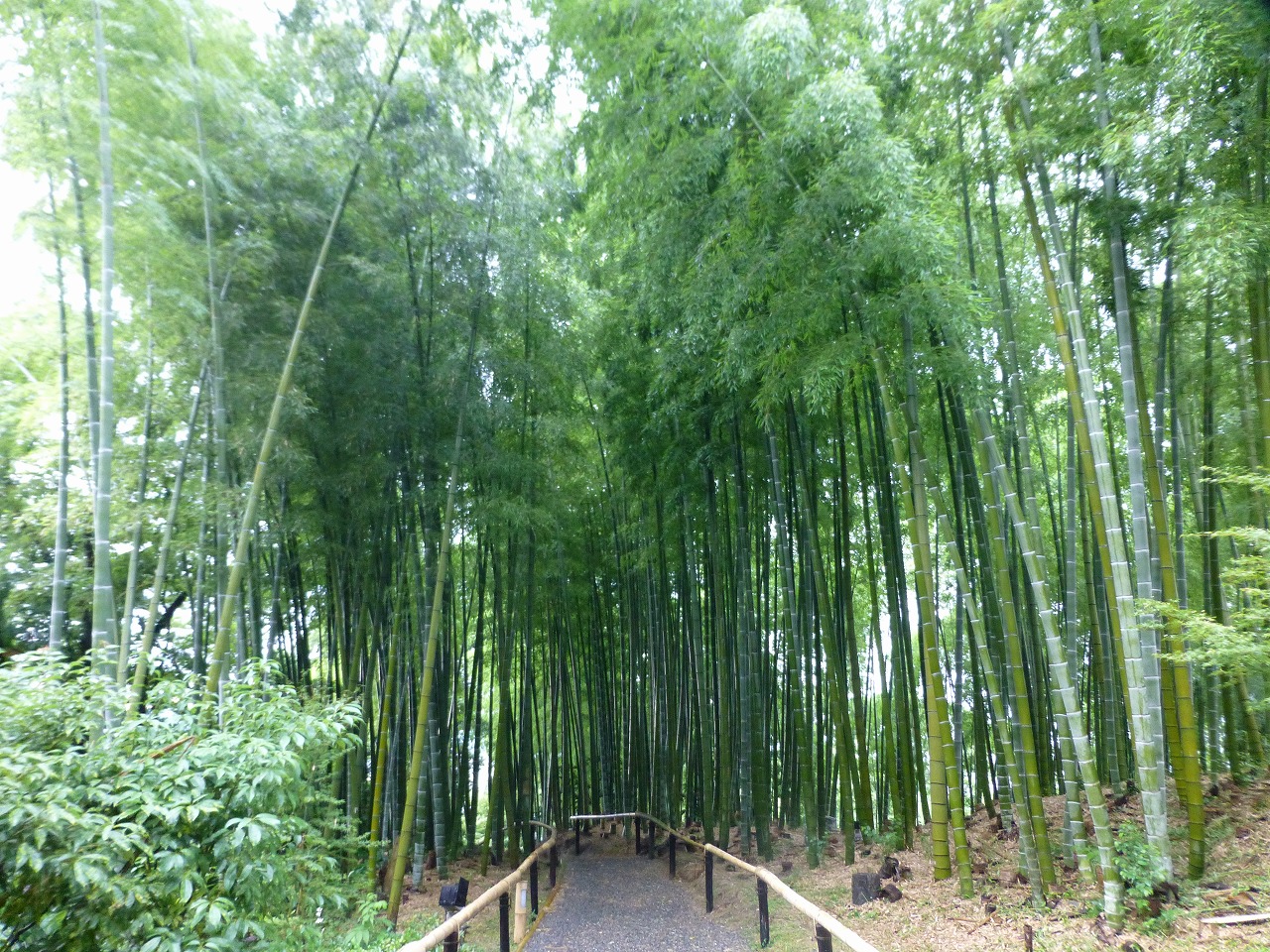 雨に濡れて竹の青が冴えて瑞々しい竹林の中。