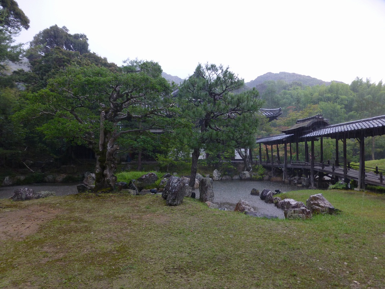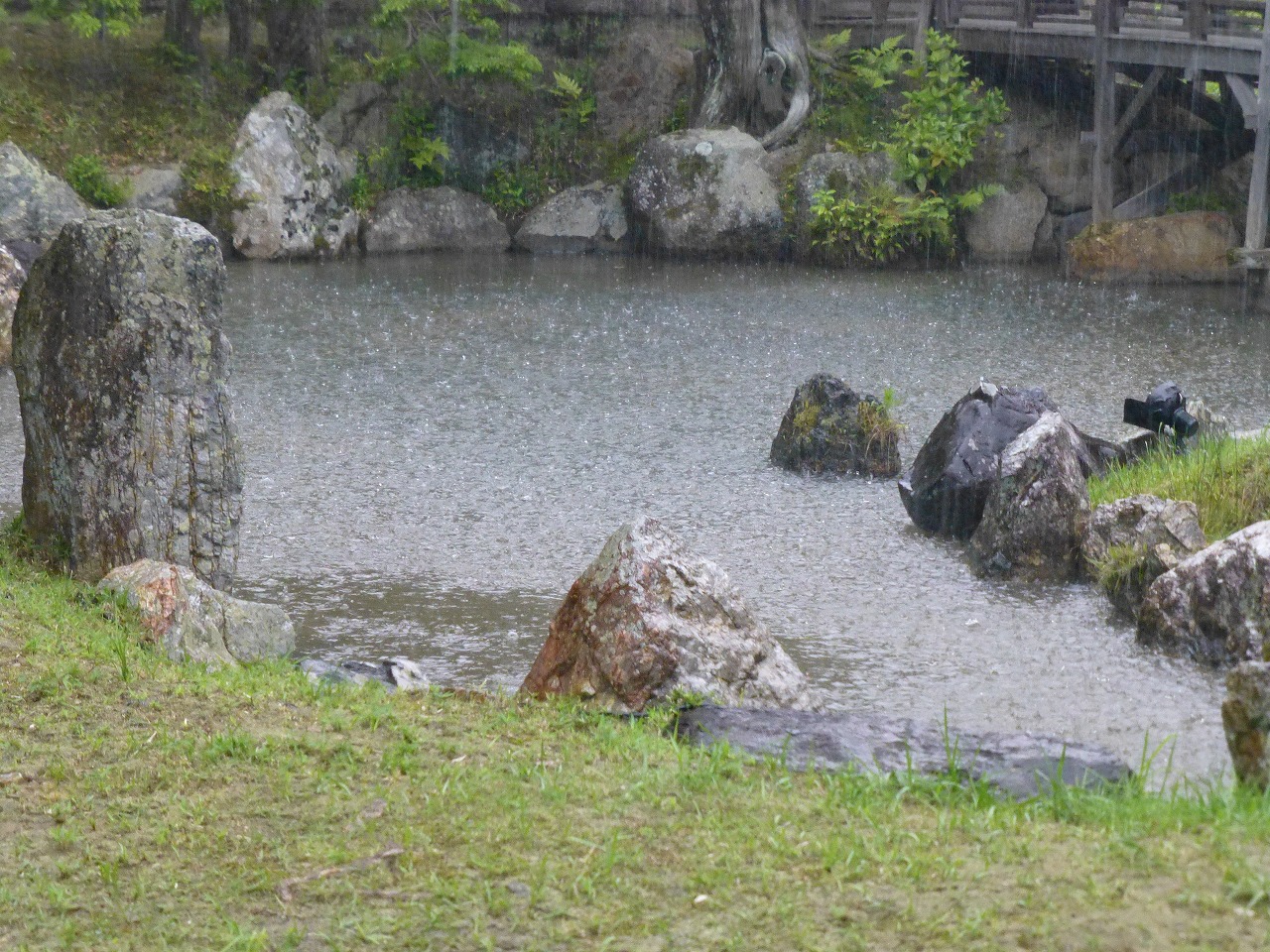 突然の雨は勢いがありました。偃月池(えんげつち)の水が跳ねます。