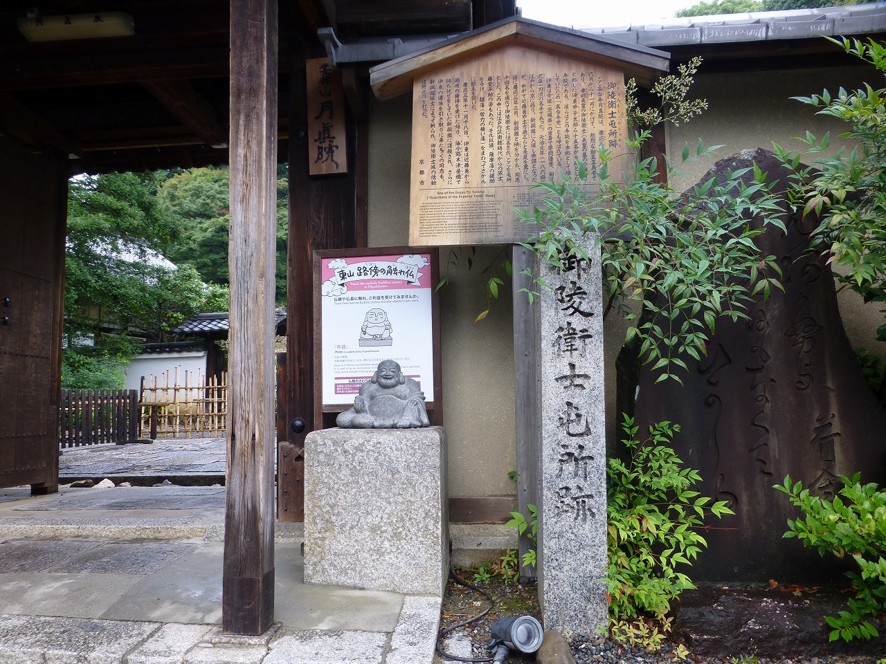(写真左・中)長屋門を入ってすぐの拝観受付と解説板。