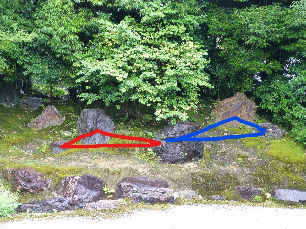 原点になるのは東北部で、枯滝石組を構成し、
