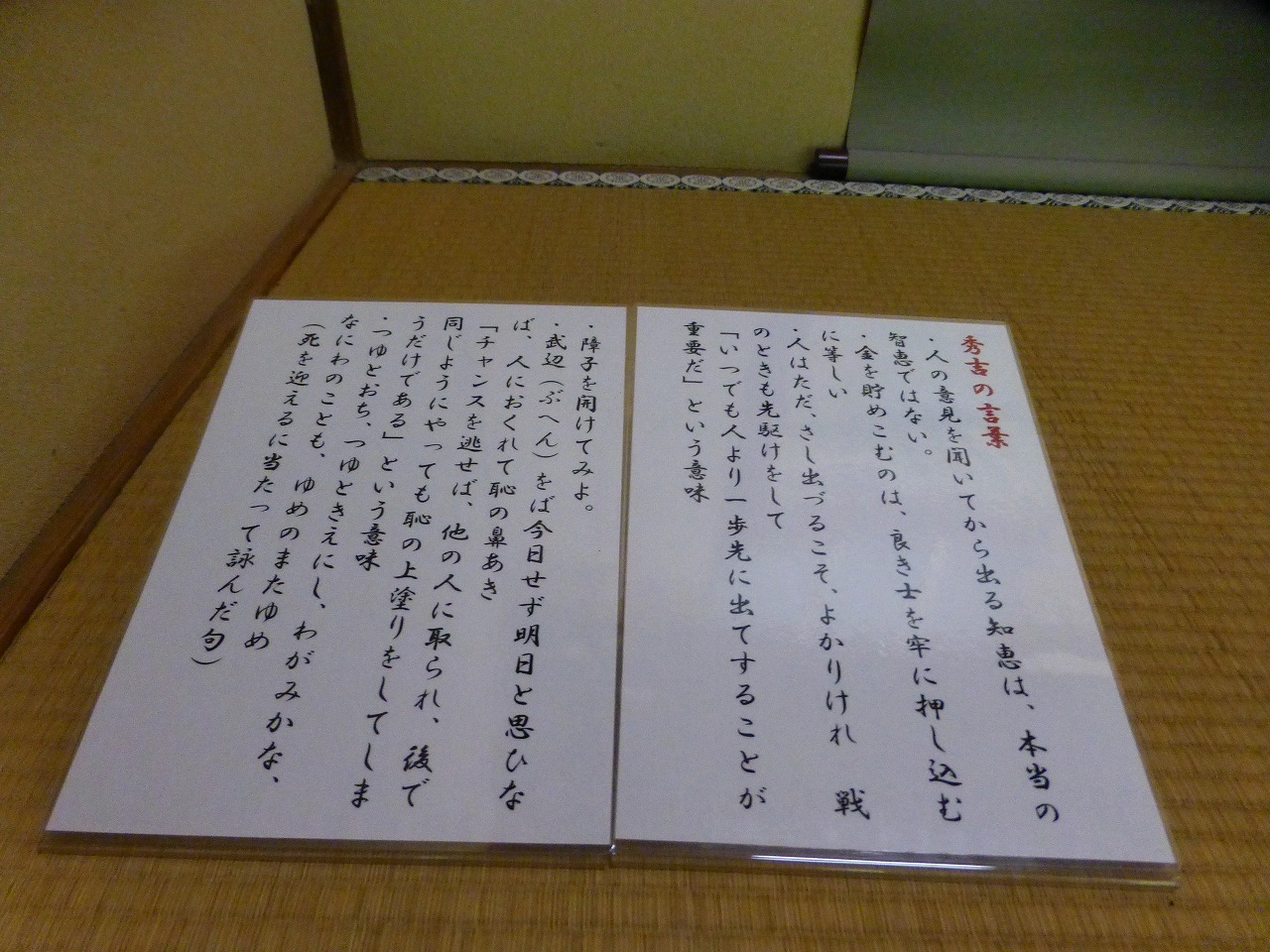 秀吉の肖像が描かれた掛け軸が。秀吉の言葉がぐっときます。