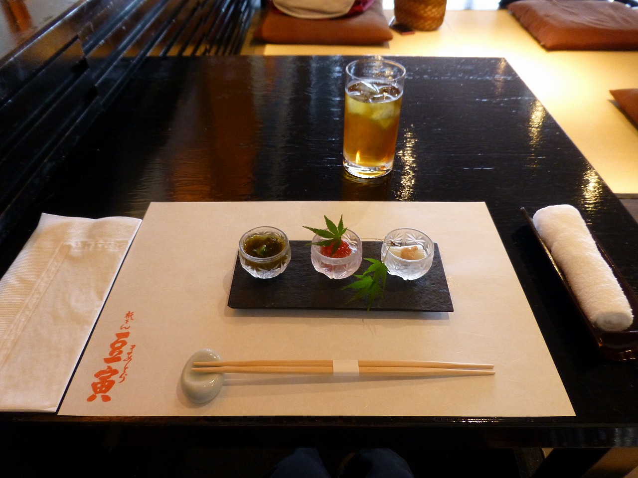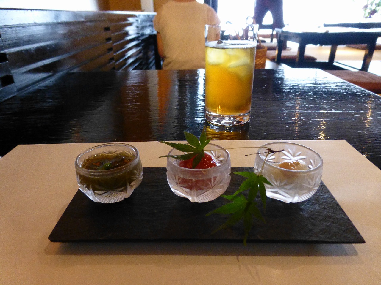 真ん中はミニトマトの…ジュレみたいな、左はもずくの… さっぱりとしたお味の3点をいただくと、