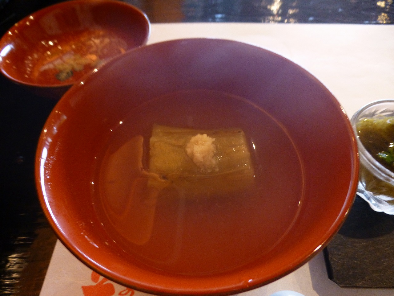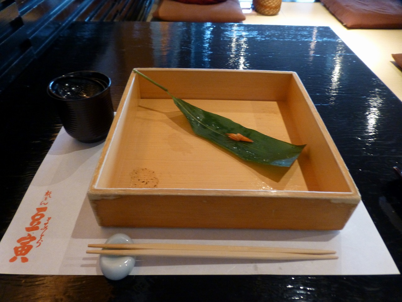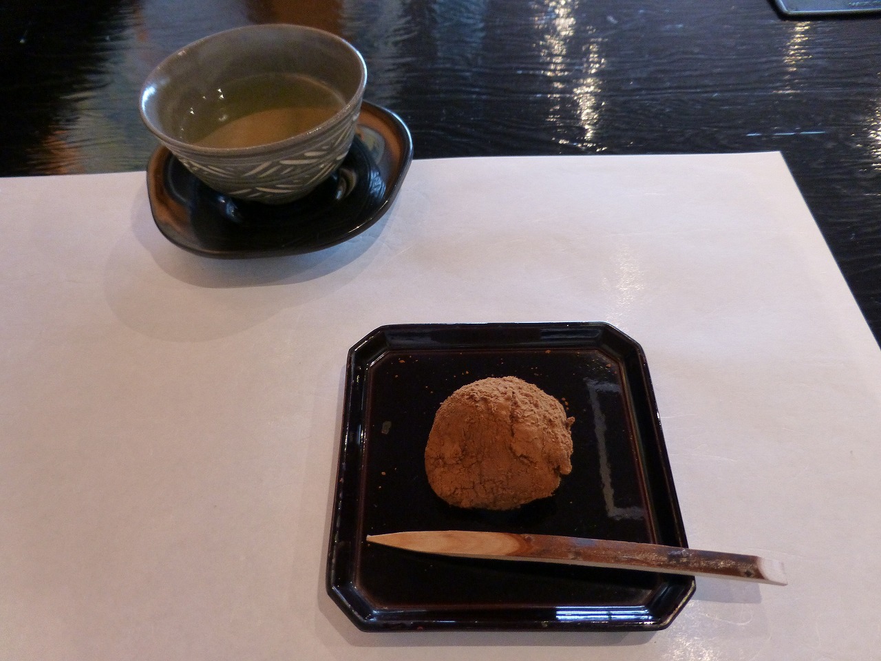 最後に甘いものは別腹、甘味の「わらび餅」と熱い緑茶が供されました。