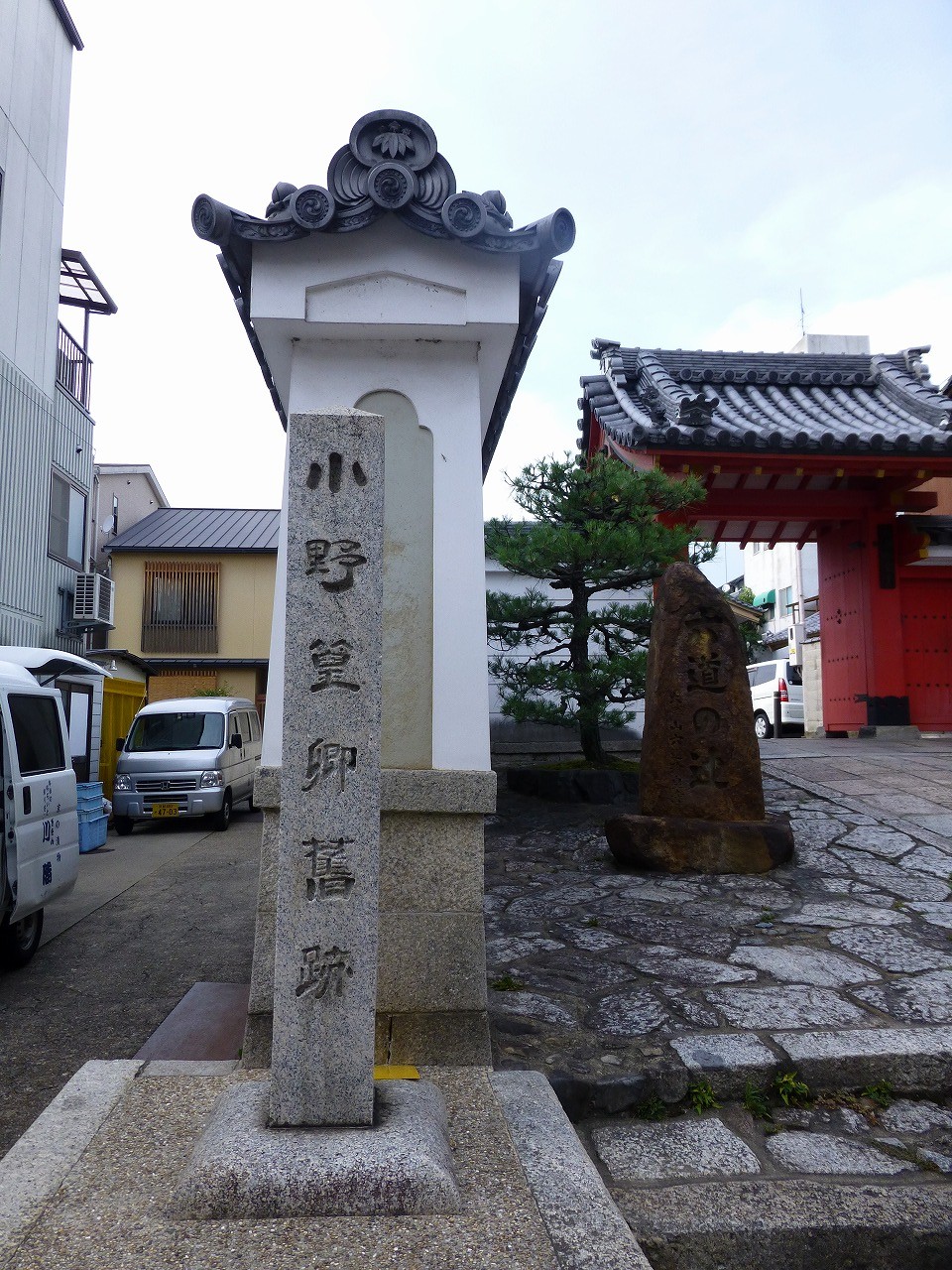 六道珍皇寺本堂と「六道の辻」中心付近に建つ三界萬霊供養塔。