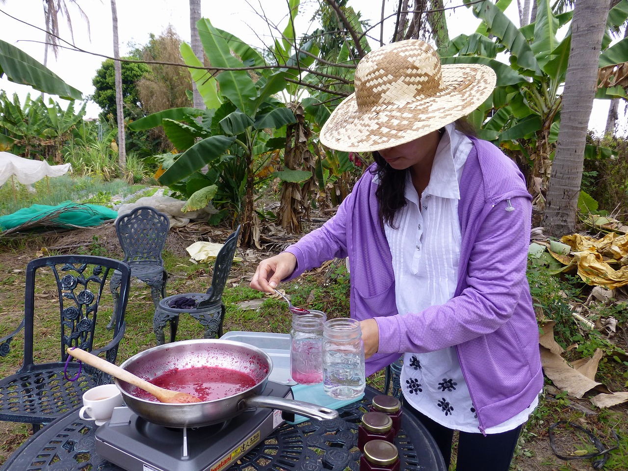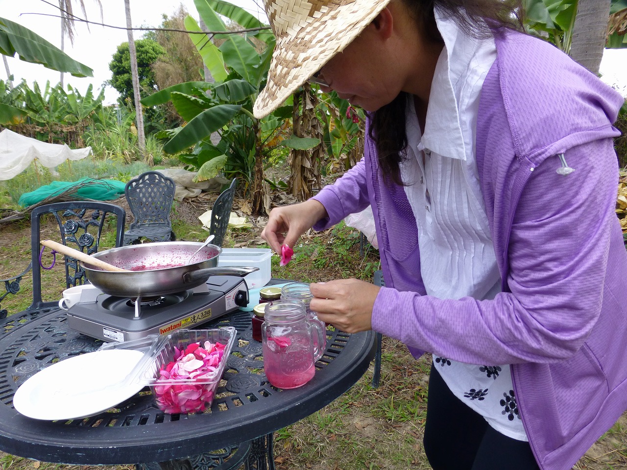 農家の方がハンドミキサーで撹拌したバラの花びらをジャムに。