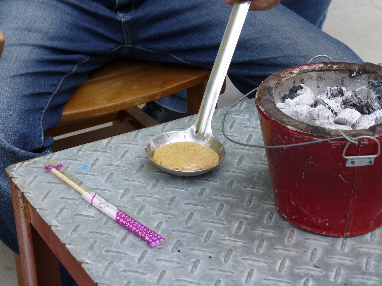 再び火にかけるのですが、ほどなく火から下ろして「おたま」から取り出します。