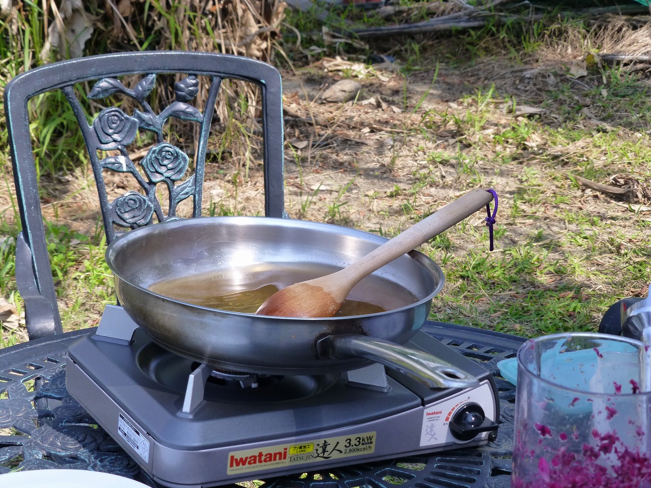 イワタニのカセットコンロ!フライパンに用意されているシロップ。