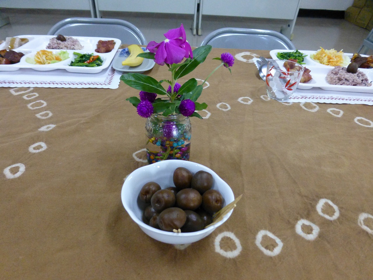 テーブルクロスは玉ねぎの皮で染色した絞り染めです。