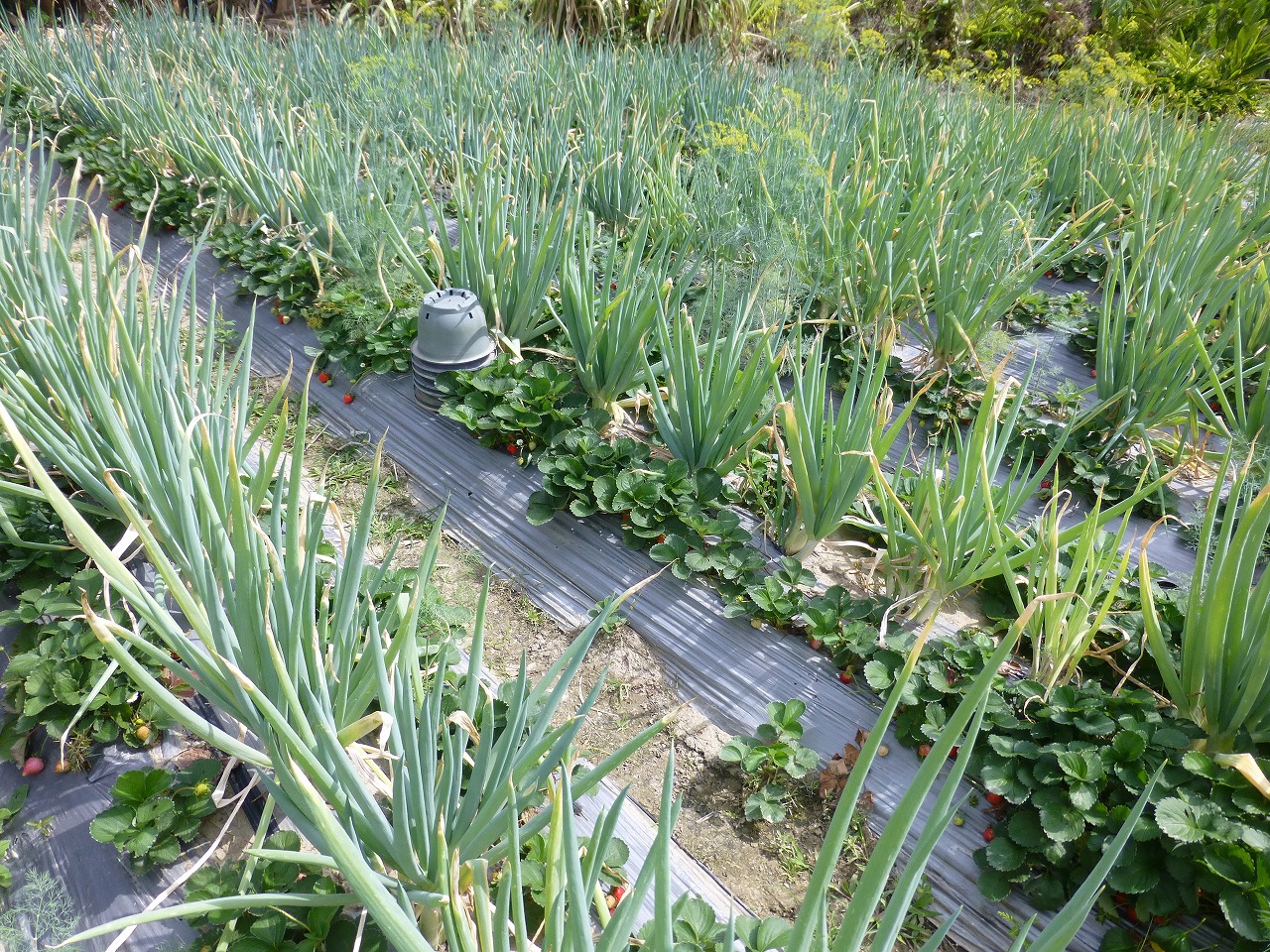 休憩の後は虫よけの葱と一緒に植えて農薬を使わない有機農法で育てられたいちごを摘む。