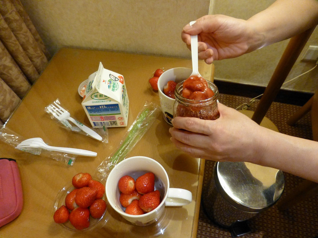 摘んだミニトマトといちごを持ち帰った宿泊先のホテルでいただきました。