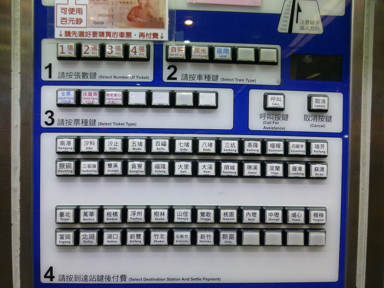 切符を買う自販機のボタン。行先を押せばいいので楽♪