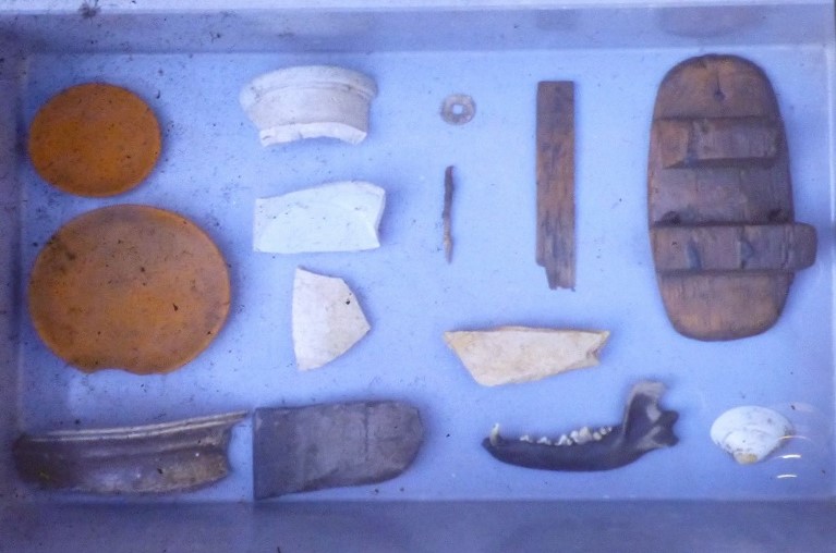 青磁碗、白磁瓶子、鉄釘、木簡、下駄、砥石(とぎいし)、獣骨、貝…