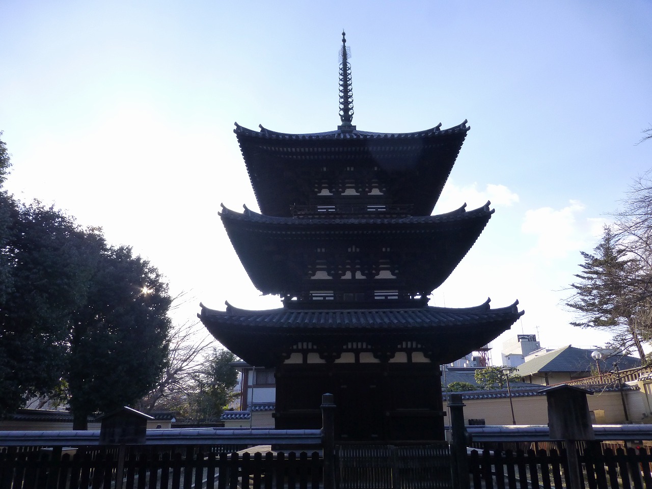 冬空を映す寒々とした水面に五重塔も。