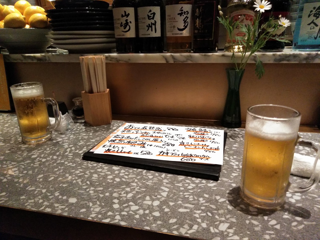 何軒かあたってみて…ひとまず空いてるカウンターで、その後テーブルに案内してくれるという