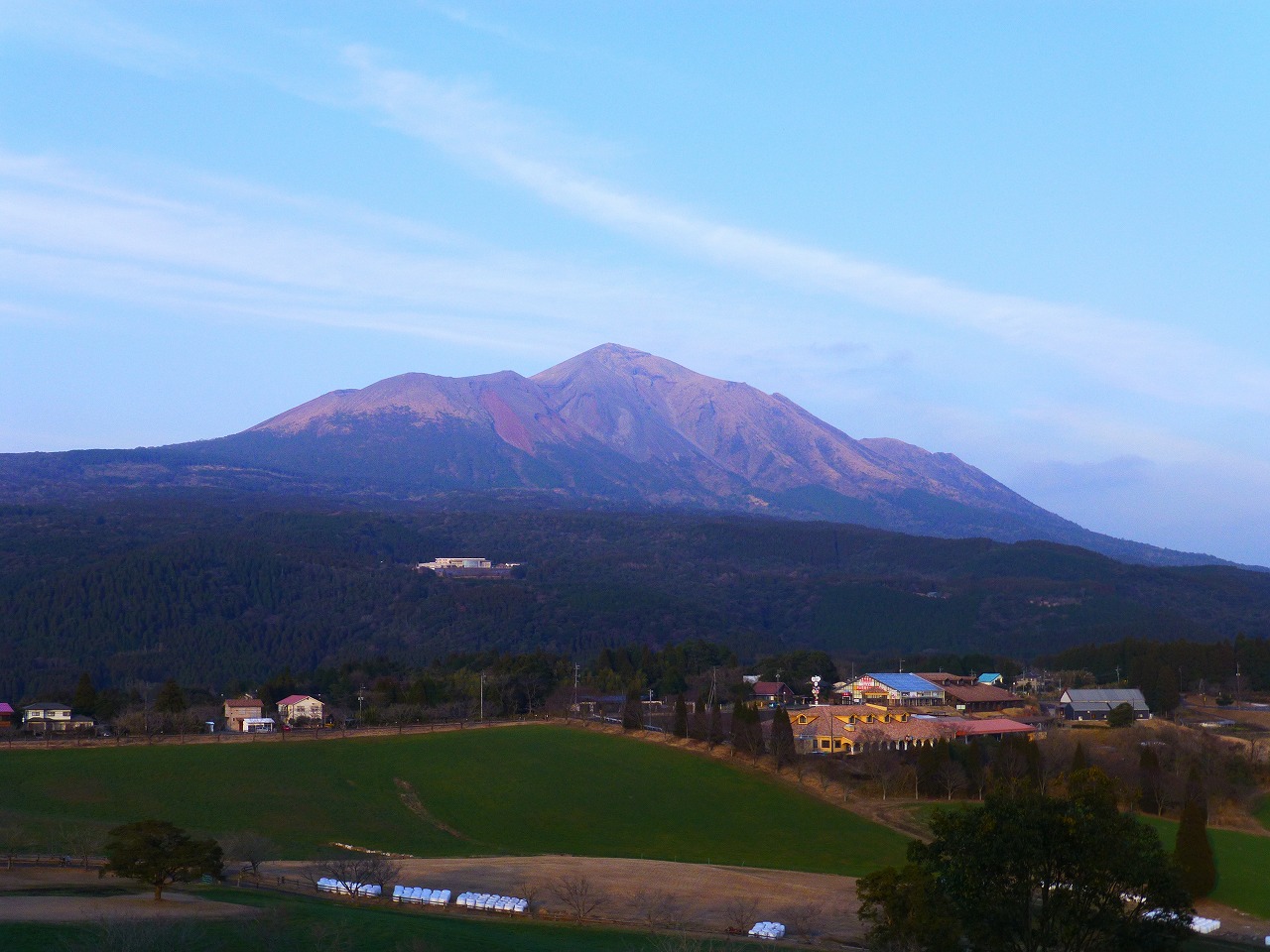 夕暮れ迫る牧場で雄大な霧島連山を眺めていると、