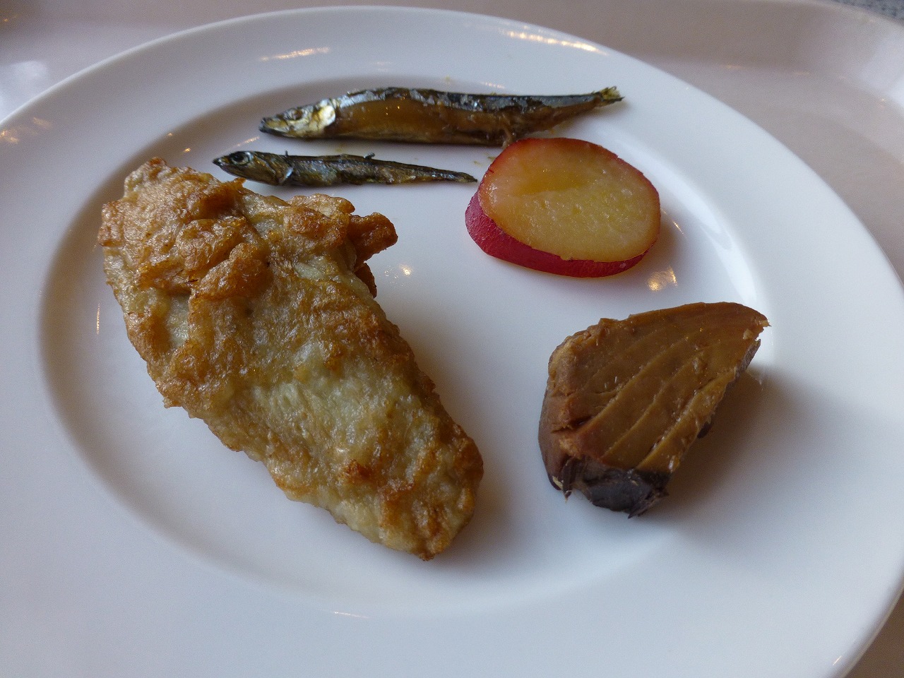 きびなご(小さいのは田作り)、ごぼうの小判揚げ、さつまいものレモン煮、カツオの角煮。