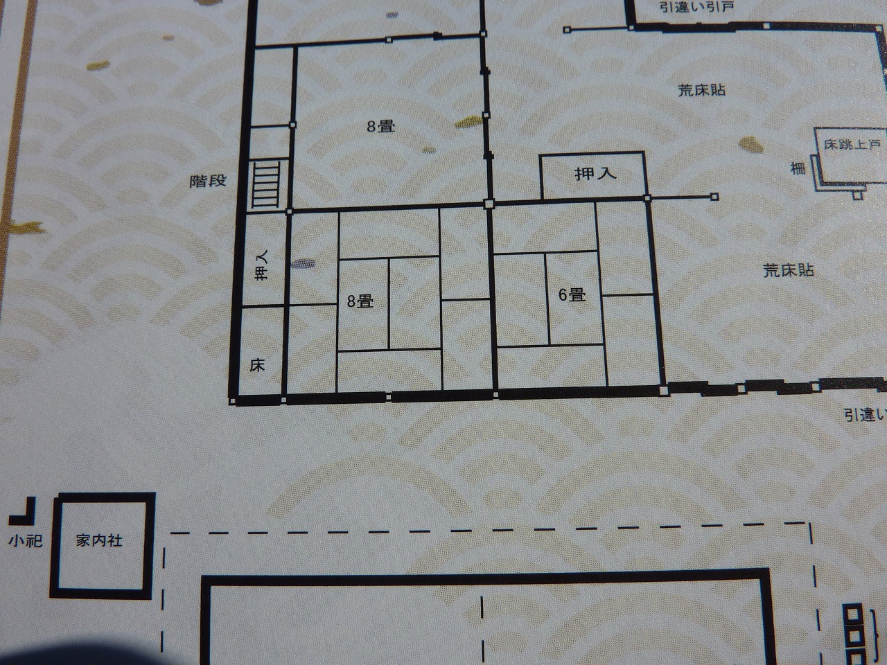 いまわたしが立っている屋外から家屋を見た八畳間の間取り図です。