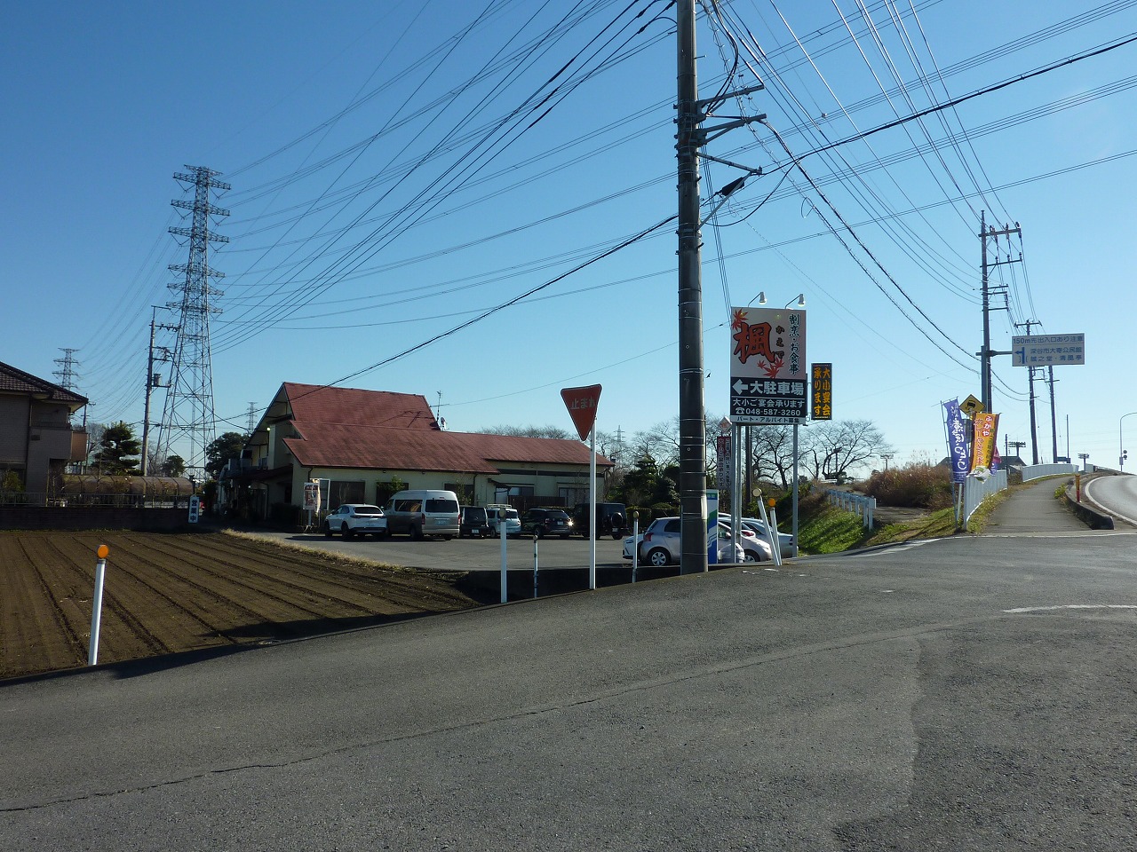 駐車場には観光バスも停車し(向かい側の畑には深谷ねぎが)