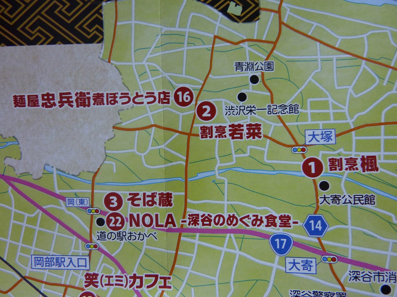 、大河ドラマ館でもらったフリーペーパー「深谷煮ぼうとう食べ歩きMAP」を開いて(画像は帰宅後撮影)、バスの中で急きょ計画を練り直すことにします。