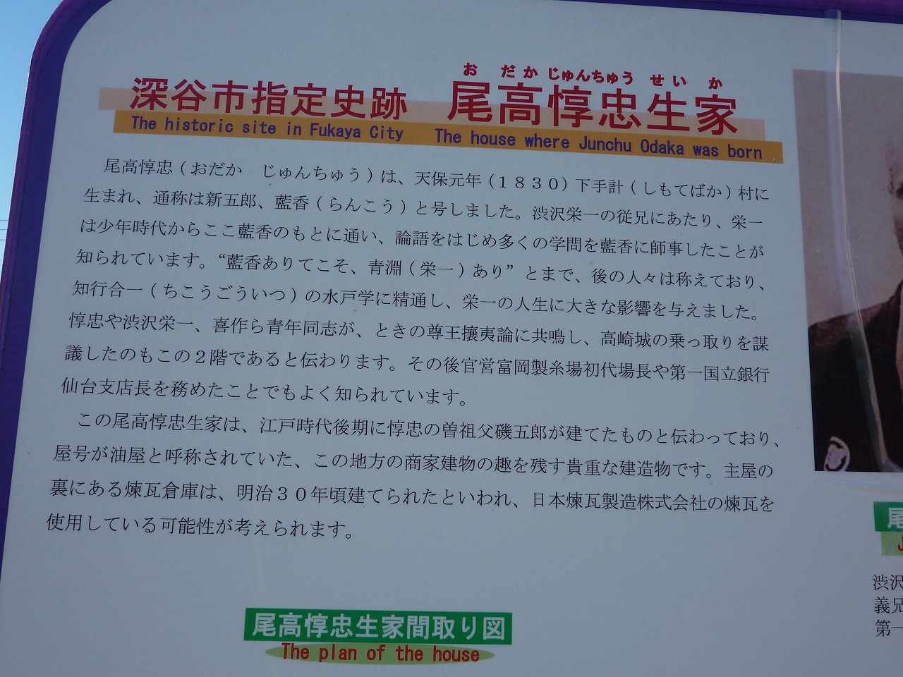 ここはひとつ奮起して、一番近い「尾高惇忠(おだかじゅんちゅう)生家」バス停で下車し、