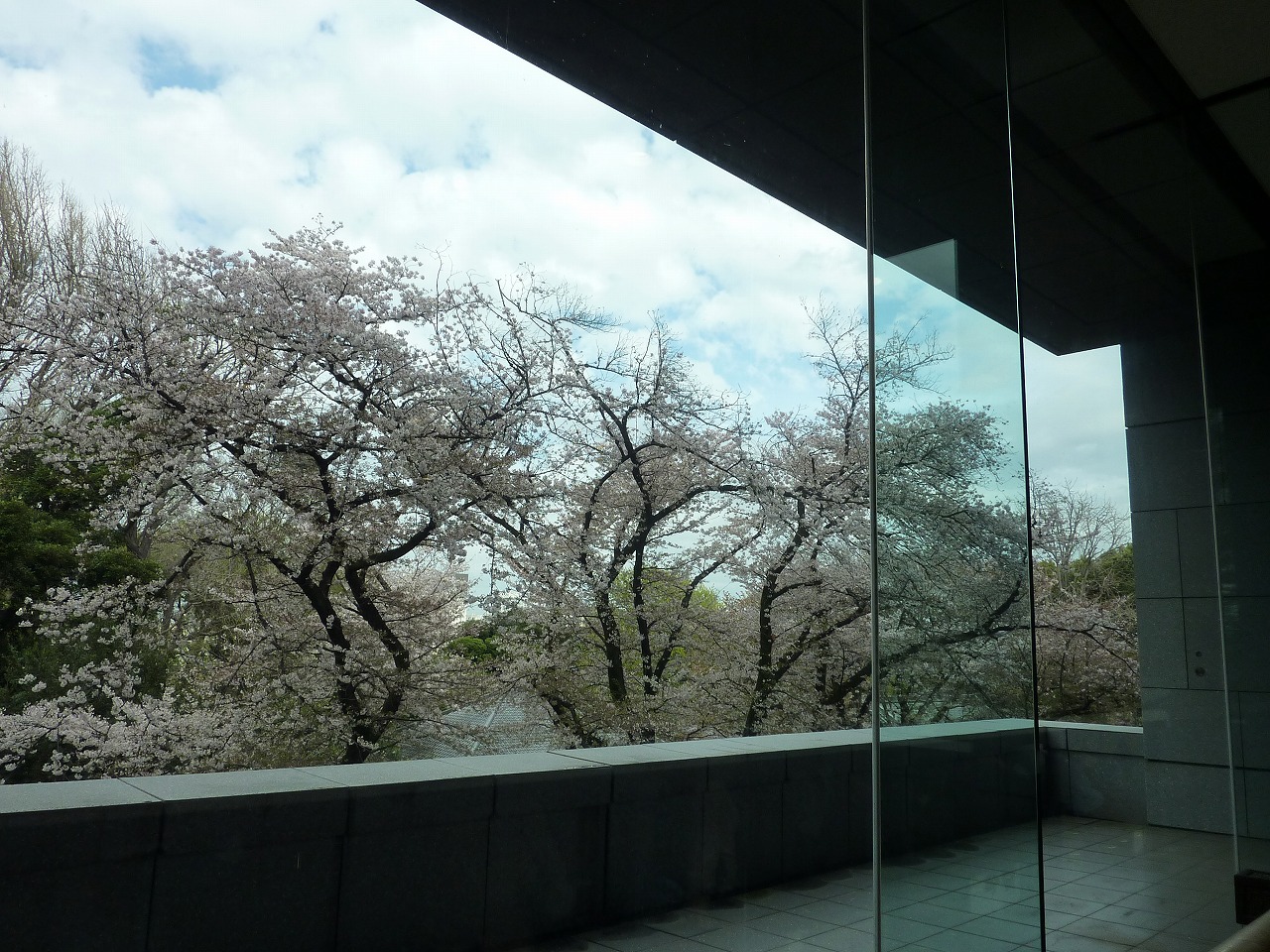 館内から大きな窓の外に見える庭園の桜がとても綺麗です。