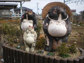 駅前に館林市名物「ぶんぶく茶釜」由来のたぬきの置物が…。