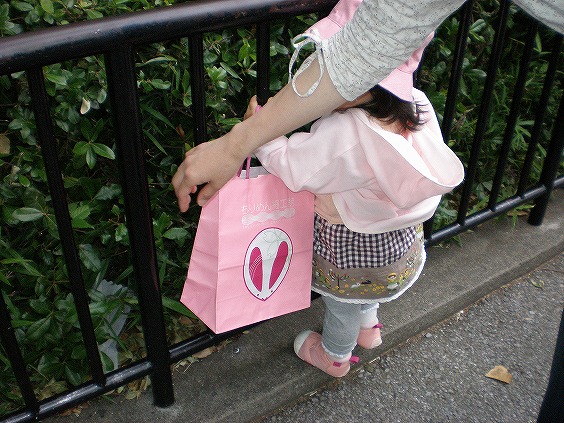 (写真右)「ちりめん細工館」の紙袋、かなりお気に入りの様子。
