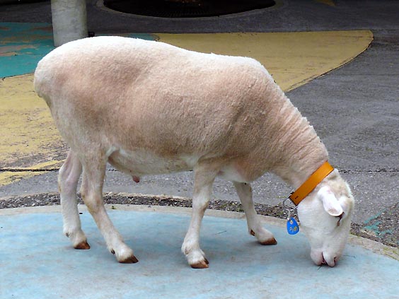 (写真右)旦ちゃんお気に入りのヒツジのウメちゃん。夏に向けて毛をカットしてサッパリ