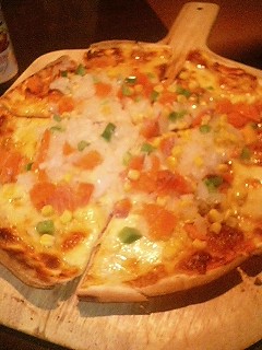 ロミロミピザクリスピーピザでチーズの上にサーモン、たまねぎ、パプリカが乗ってました