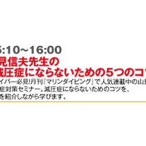 13:30〜14:20 山見信夫先生による「これって減圧症?〜ダイバーたちの体験談〜」 『マリンダイビング』読者から寄せられた減圧症の疑問に、潜水医学のスペシャリスト・山見信夫先生がお答えします。これからも安全に楽しくダイビングを続けるために、ダイバーは必須のセミ ...