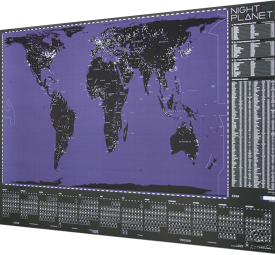 光る点(蓄光タイプで暗くすると実際に光ります)は、人工衛星がとらえた都市の光の様子を表しています。