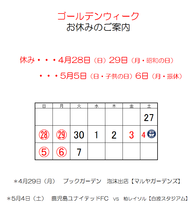 April 24, 2019 GWのお休み amazon primeで「Low&Order」をシーズン20まで観終わり、ただいま「THE WIRE」のシーズン4を観ている店主です。HBOドラマは(Low&OrderはHBOではないが大傑作)クオリティが高過ぎて次々と観てしまい、海外ドラマ廃人になる気持ちが良く分かります。Netflixも加入してるのでタイトルもザクザクあり大変。もちろん鹿児島ユナイテッドのホームゲームは生観戦(祝連敗脱出!先日のAT弾は痺れたぁ!!)ですが、アウェーはDAZNとネット配信にどっぷりでございます。さてさて今年のGWは暦の上では10連休なんですよね。しかし今までに無い長期連休ですが、周りからは戸惑いの声がほとんどというのがナントモ。集中するより分散して休みを取れる仕組みを作るほうがいいと思うんですけど。そんな弊店のGWは、4月28日(日)29日(月・昭和の日)5月5日(日・こどもの日)6日(月・振替休日)がお休みでございます。”暦通り10連休!”なんてムリムリ〜