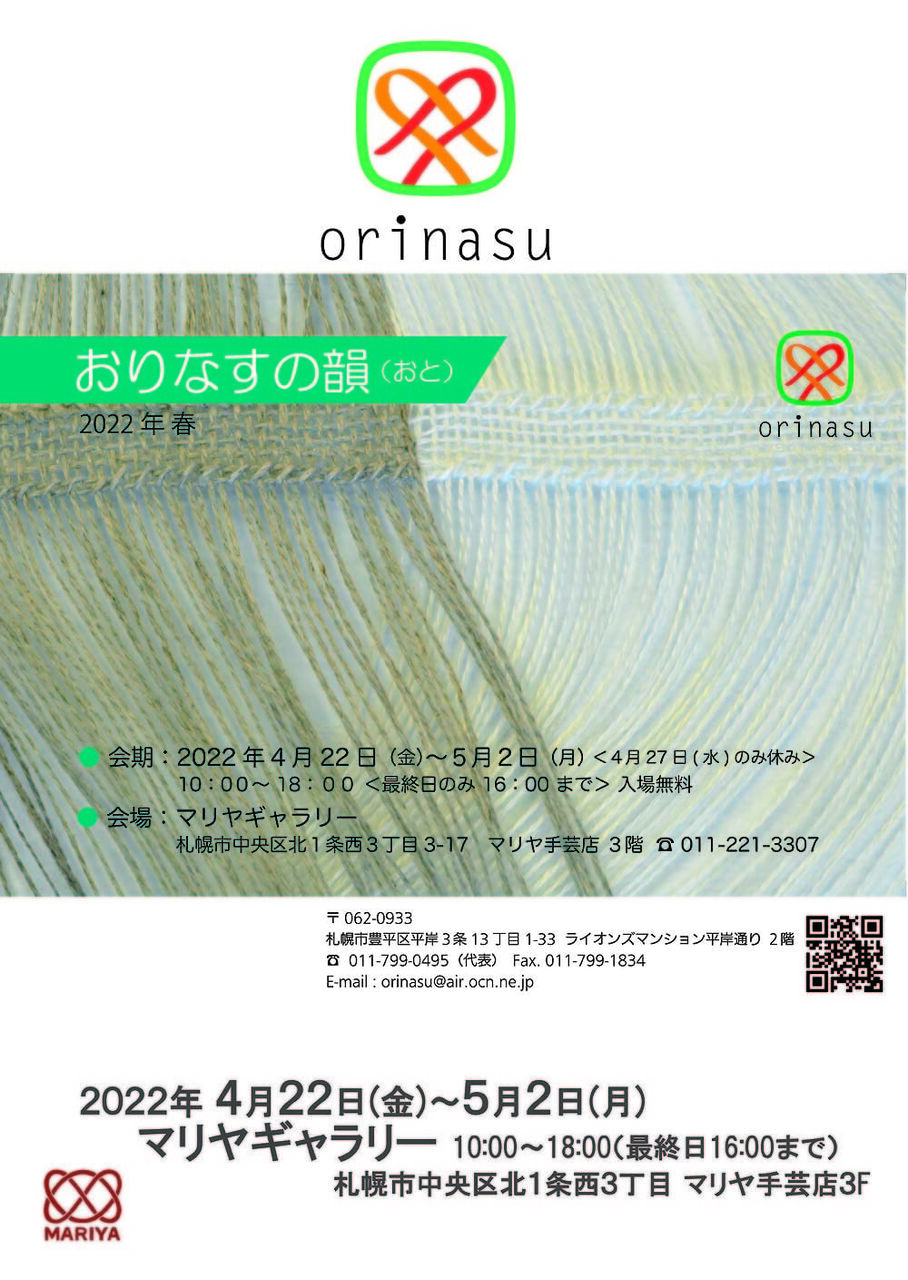 2022年04月16日 【終了】【マリヤギャラリー】『おりなすの韻(おと)2022春ハンドメイド作品展示販売会』2022年4月22日~5月2日※4/27休 ※本イベントは終了いたしました。札幌南平岸のおりなすさんが、マリヤギャラリーで展示販売会を行います。手織り・レザークラフト・刺繍・食品など手作りを通して様々な活動をされています。エネルギッシュな皆さんの作品をぜひお求めください。おりなすの韻(おと)ハンドメイドオリジナル作品の展示販売を行います。会期:2022年4月24日(木)~5月2日(月)10:00~18:00(最終日は16:00まで)入場無料 ※4月27日(水)はお休みです。おりなすとは様々なものがつながり組み合わせて描きだすことを意味しています。様々なものとつながり豊かな生活やものづくりをおりなしていきたいと考えています。主催:就労継続支援b型事業所 おりなす HP https://www.orinasu.info/ FB https://www.facebook.com/orinasub/